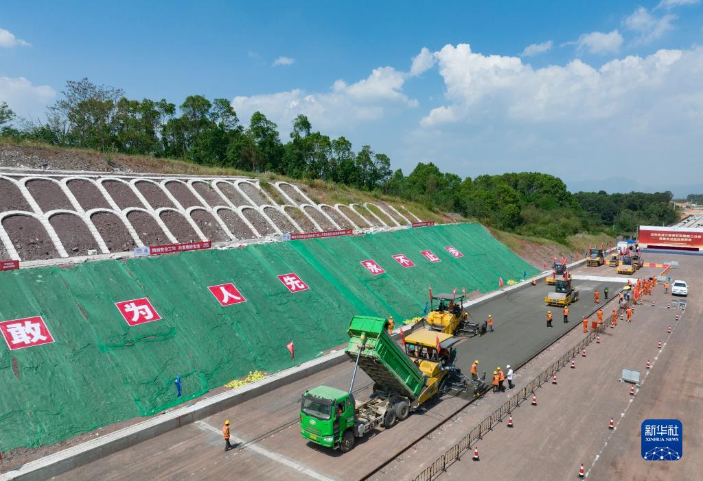 9月16日,來自中國能建葛洲壩路橋公司的建設者在武陽高速黃石段施工(無人機照片)。