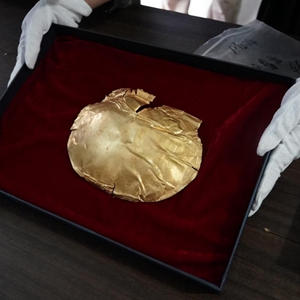 一件比三星堆黃金面具年代還早的金覆面,日前在鄭州商城遺址一高等級貴族墓中出土,同時出土的還有4個金泡、金箔以及以金箔為地鑲嵌綠松石的牌飾等,刷新了對中原地區黃金文化的認知。