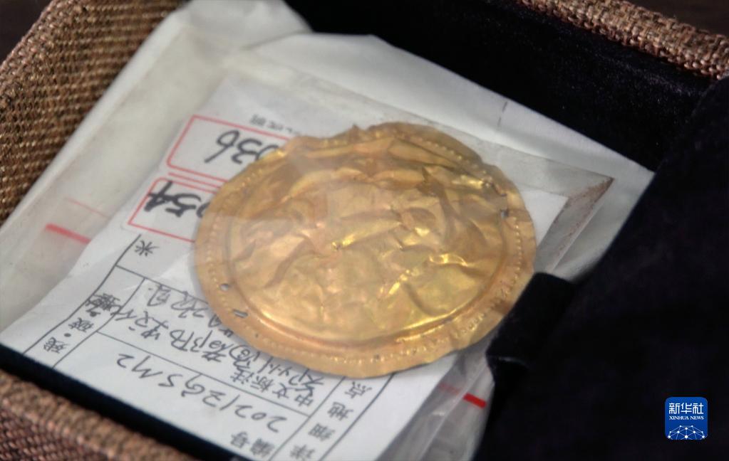 這是7月15日拍攝的鄭州商城遺址高等級貴族墓M2中出土的金泡。