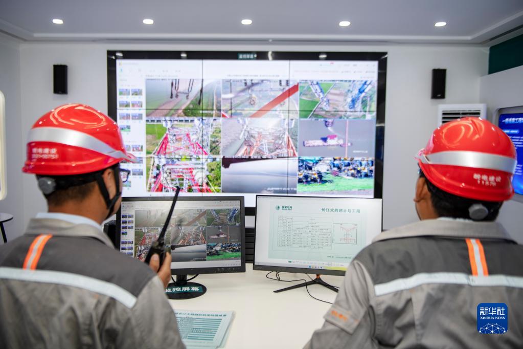 9月16日,安徽送變電工程有限公司施工人員在工地智慧監控中心指揮跨江作業。