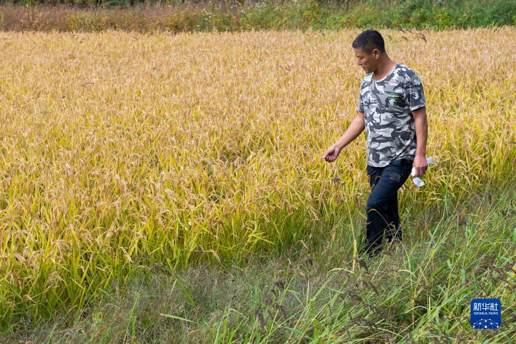 9月16日,村民在元寶村附近一片稻田中查看水稻長勢。