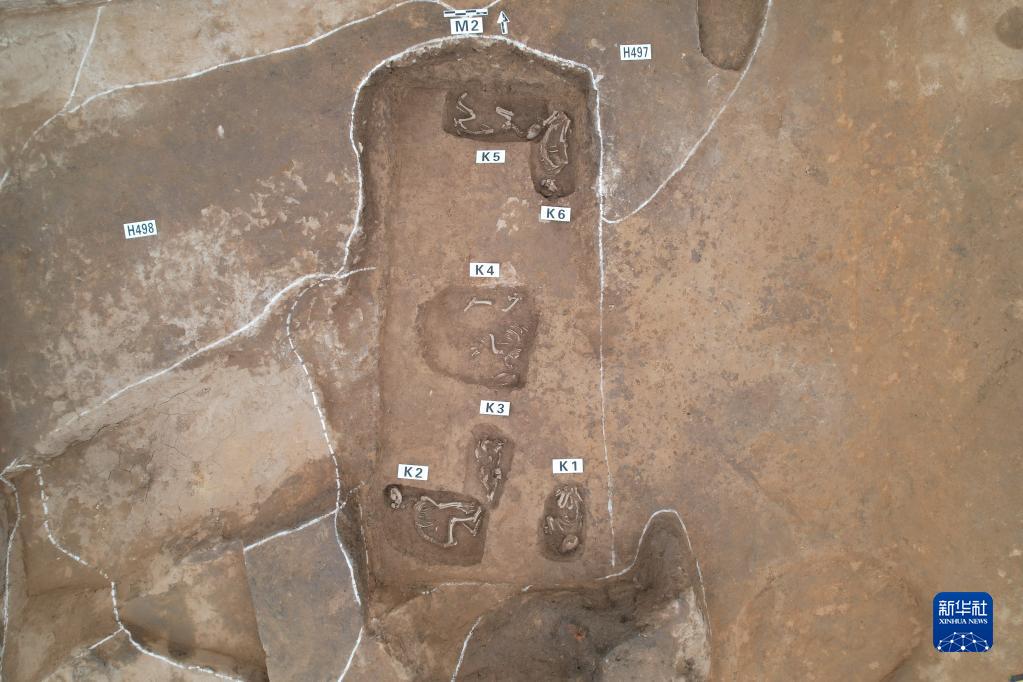 這是3月3日拍攝的鄭州商城遺址高等級貴族墓M2底部的殉狗坑(無人機照片)。