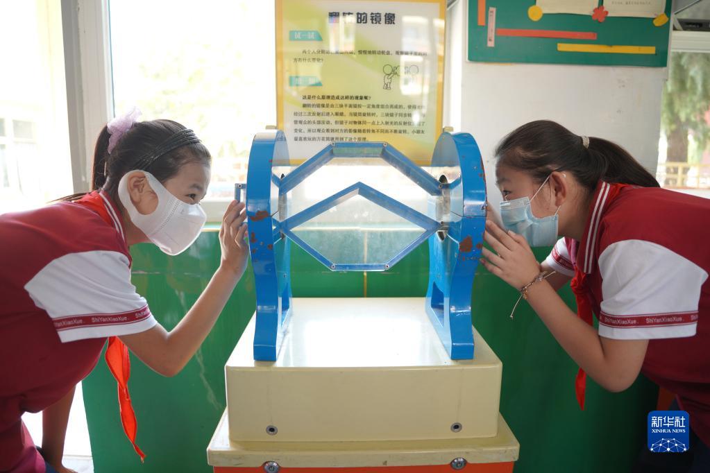 9月16日,河北省邢臺市內丘縣實驗小學學生在科技大篷車巡展活動中體驗“翻轉的鏡像”。