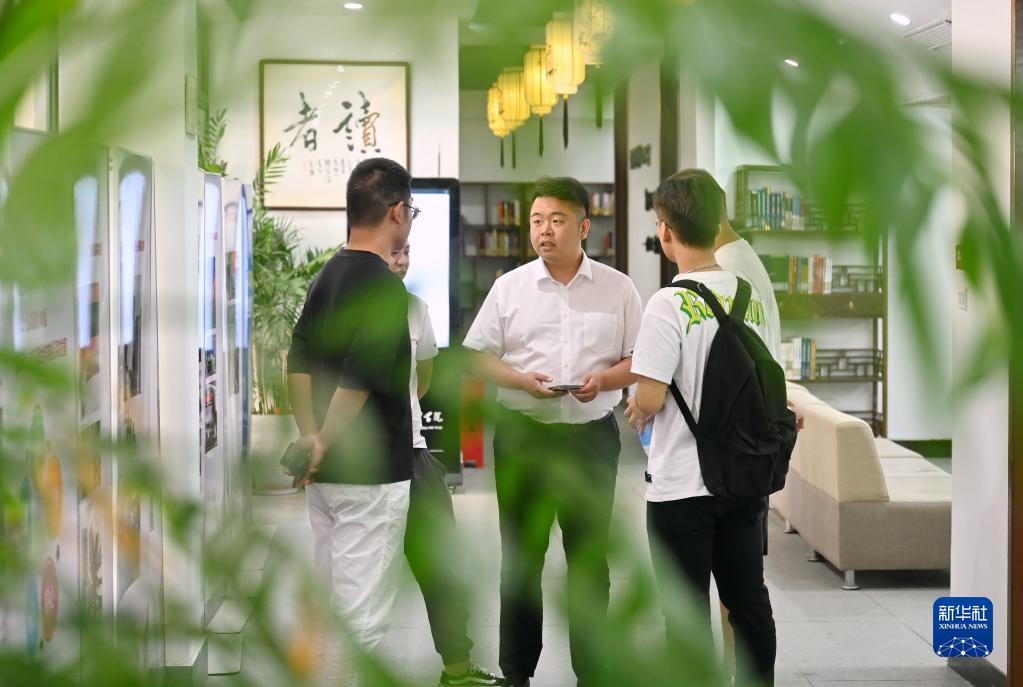 9月16日,林俊杰(中)在福州外語外貿學院與在校大學生創新創業團隊成員交流。
