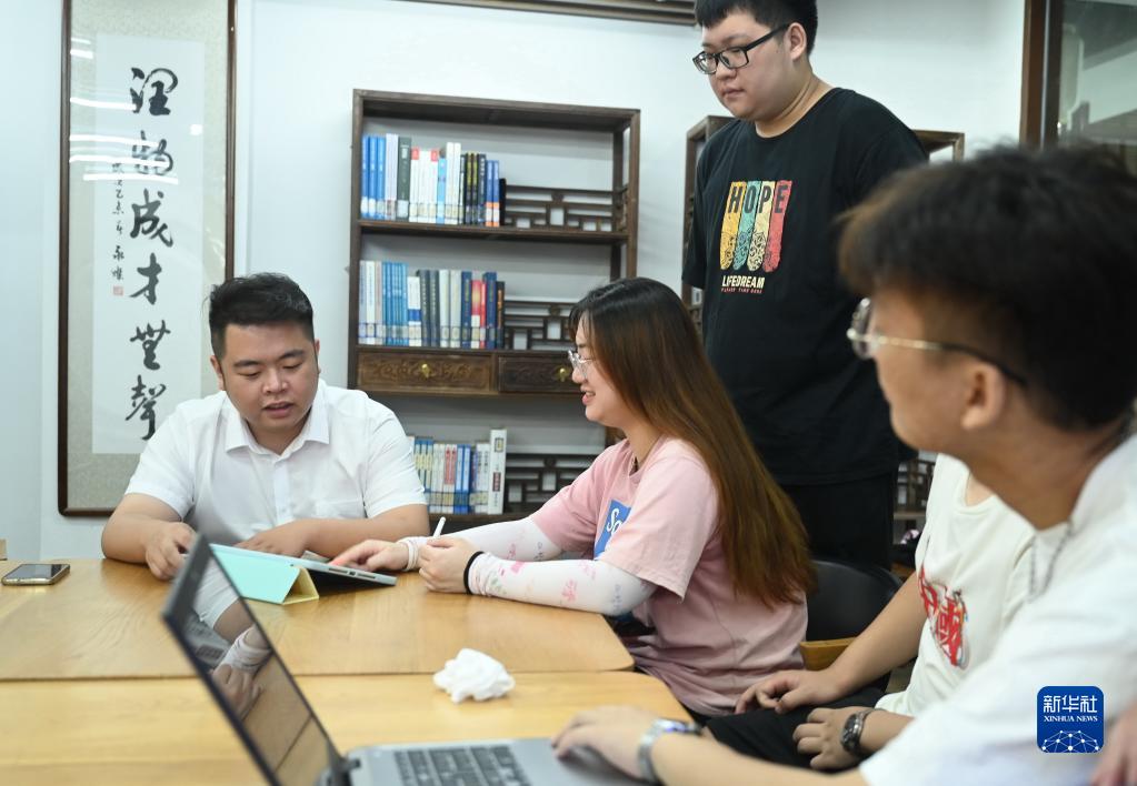 9月16日,林俊杰(左一)在福州外語外貿學院與大學生創新創業團隊成員討論公司新創的“胖小俊”IP人物和品牌塑造方案。