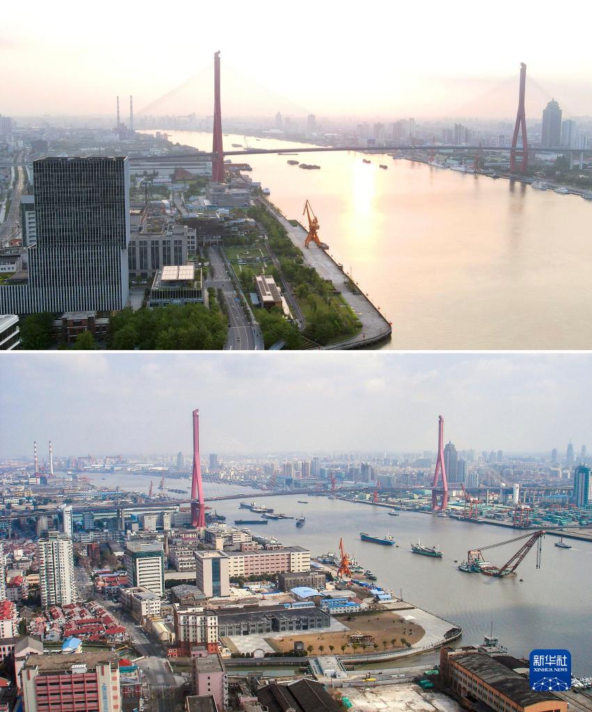 拼版照片:上圖為2022年7月28日拍攝的楊浦濱江(無人機照片,新華社記者方喆攝);下圖為2013年2月16日拍攝的楊浦濱江舊貌(資料照片,趙明玉攝)。