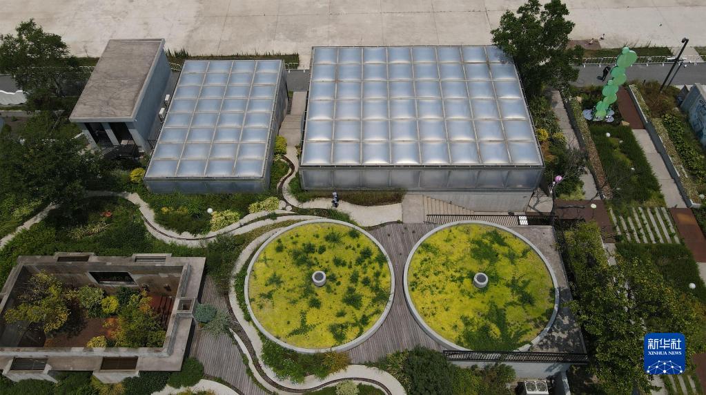 2022年7月12日拍攝的由上海制皂廠污水處理池改造而成的“皂夢空間”,內設咖啡廳、手工坊、文創展示等區域(無人機照片)。