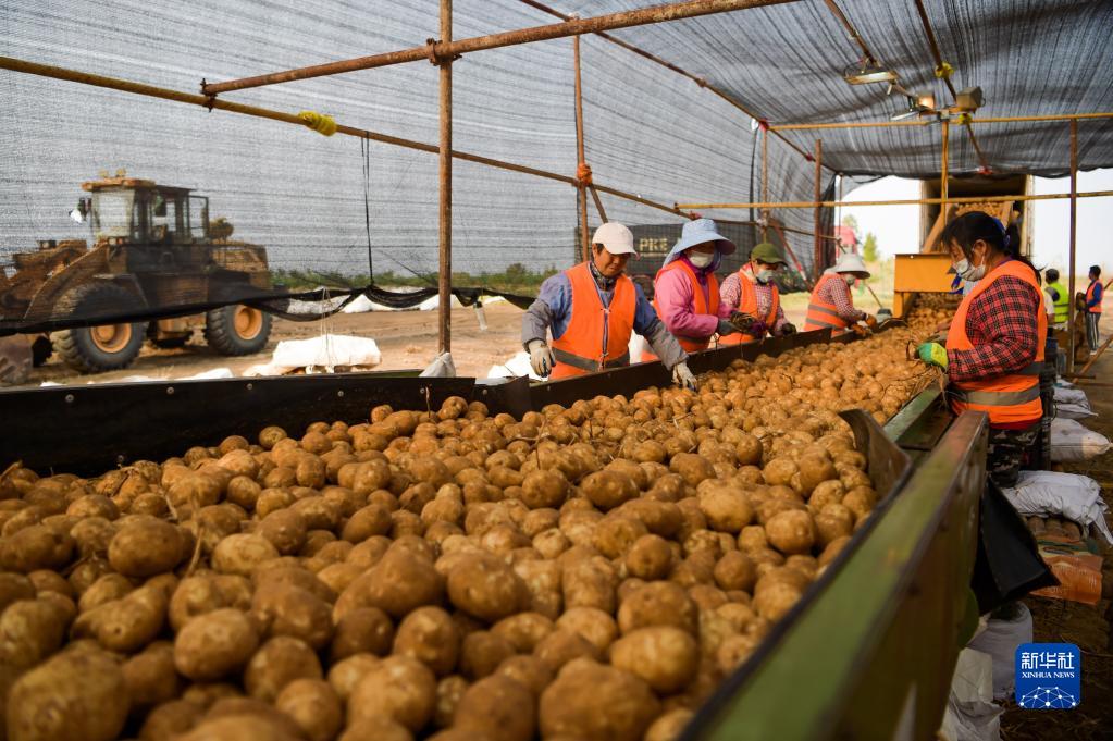 近日,位于庫布其沙漠腹地的內蒙古自治區鄂爾多斯市杭錦旗阿木古龍健康產業園內的土豆迎來豐收季,工人們篩選、裝運土豆,一派繁忙景象。近年來,杭錦旗通過技術改良提高沙地利用價值,開展土豆等農作物種植,促進當地農業發展。