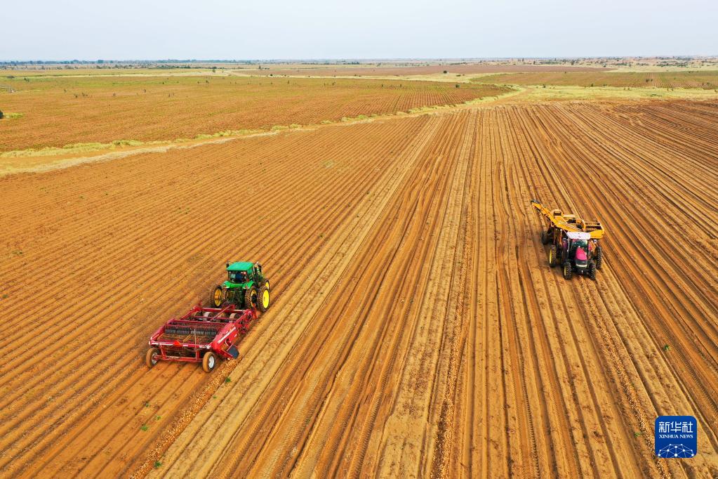 農機在杭錦旗阿木古龍健康產業園內收土豆(9月16日攝,無人機照片)。