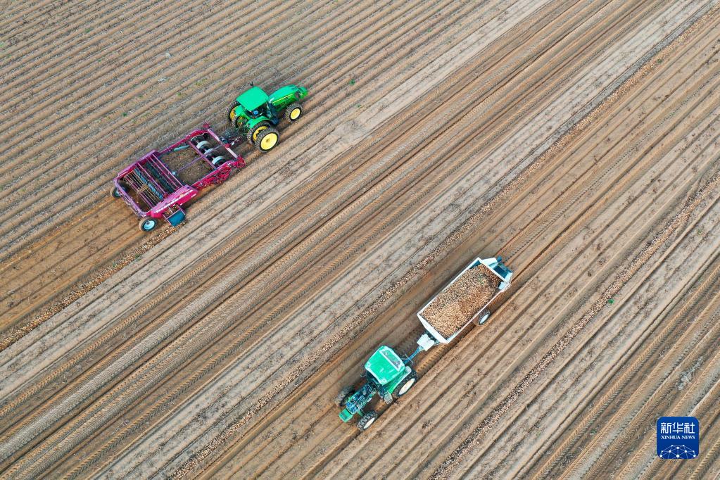 農機在杭錦旗阿木古龍健康產業園內收土豆(9月16日攝,無人機照片)。