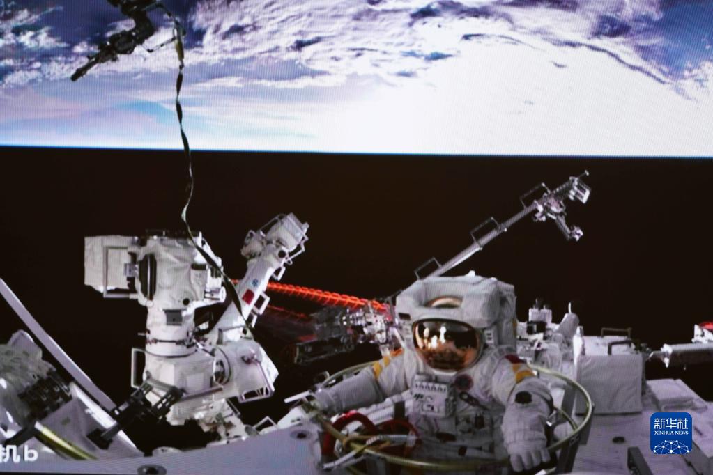 9月17日在北京航天飛行控制中心拍攝的神舟十四號航天員蔡旭哲出艙畫面。