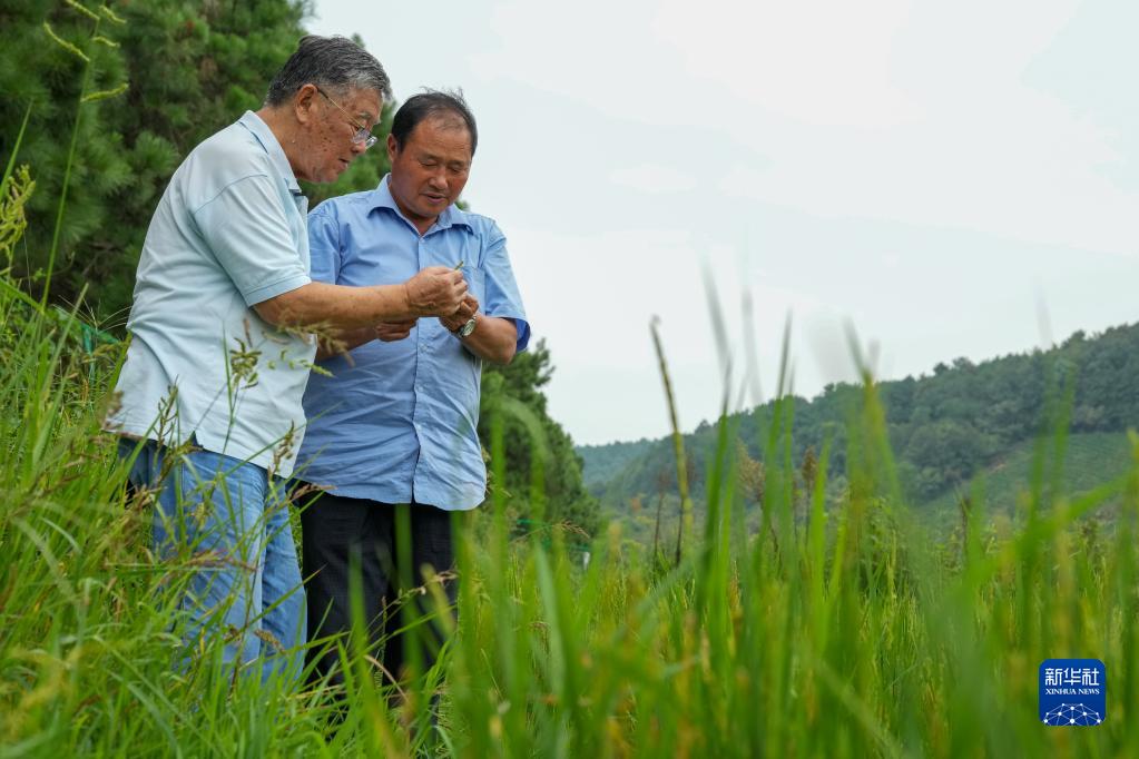 趙亞夫(左)在江蘇省句容市天王鎮戴莊村查看水稻長勢(2022年9月9日攝)。