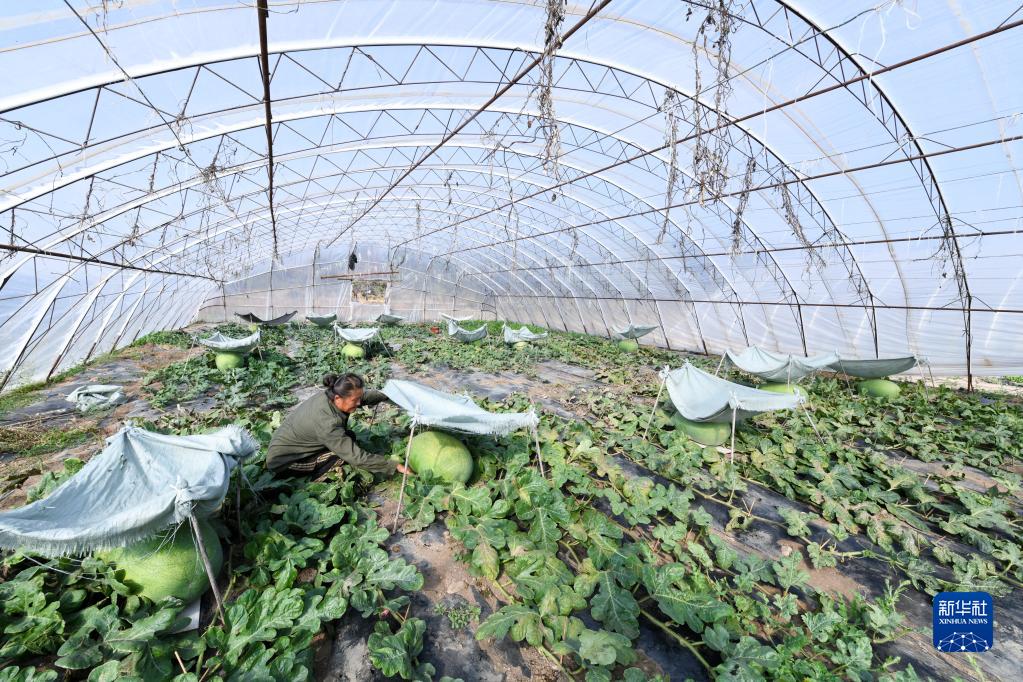 農民在興十四村現代農業示范園區大棚溫室中管理栽植的西瓜(9月16日攝)。