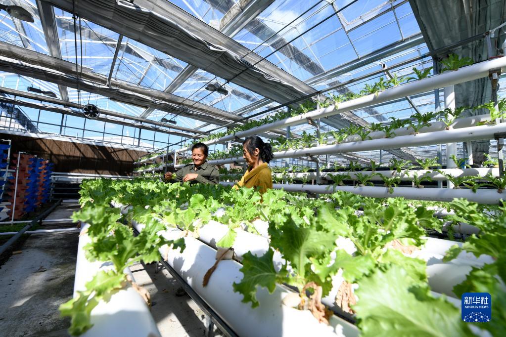 農民在興十四村現代農業示范園區大棚溫室中管理無土栽培蔬菜(9月16日攝)。