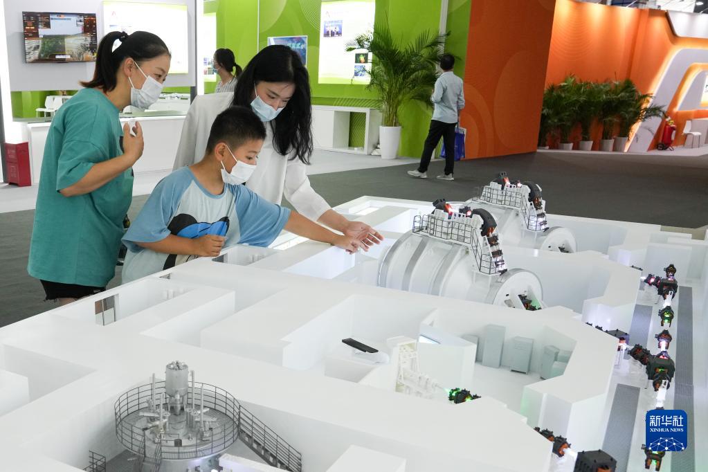 9月17日,在2022年全國大眾創業萬眾創新活動周合肥主會場的主題展區,家長帶著孩子參觀超導回旋質子治療系統模型。