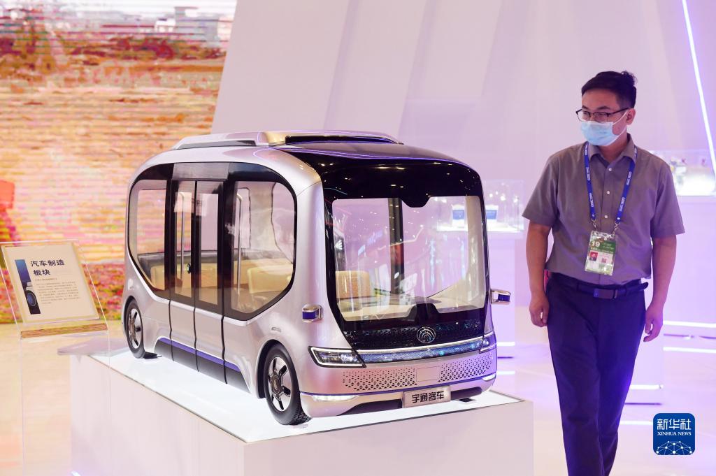 9月17日,在南寧國際會展中心,一名參觀者在觀看自動駕駛巴士模型。