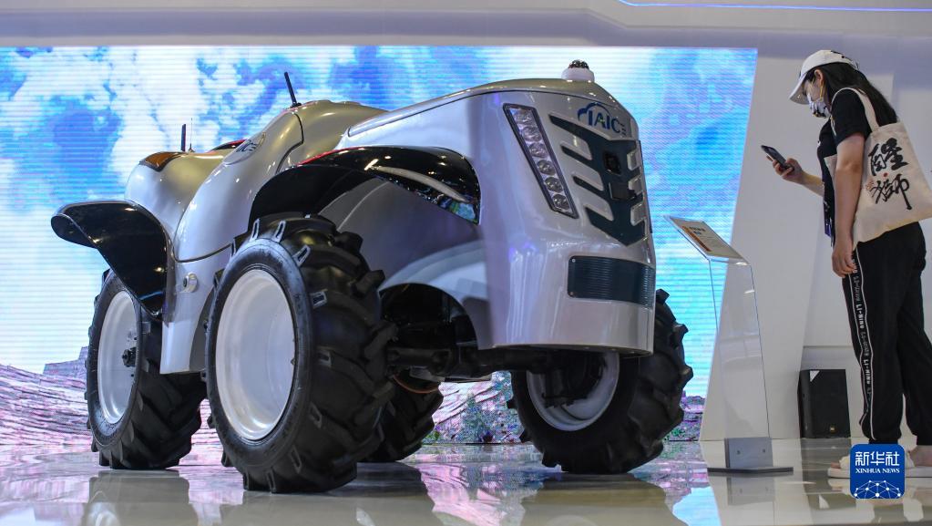 9月17日,一名參觀者在觀看一款無人駕駛拖拉機。
