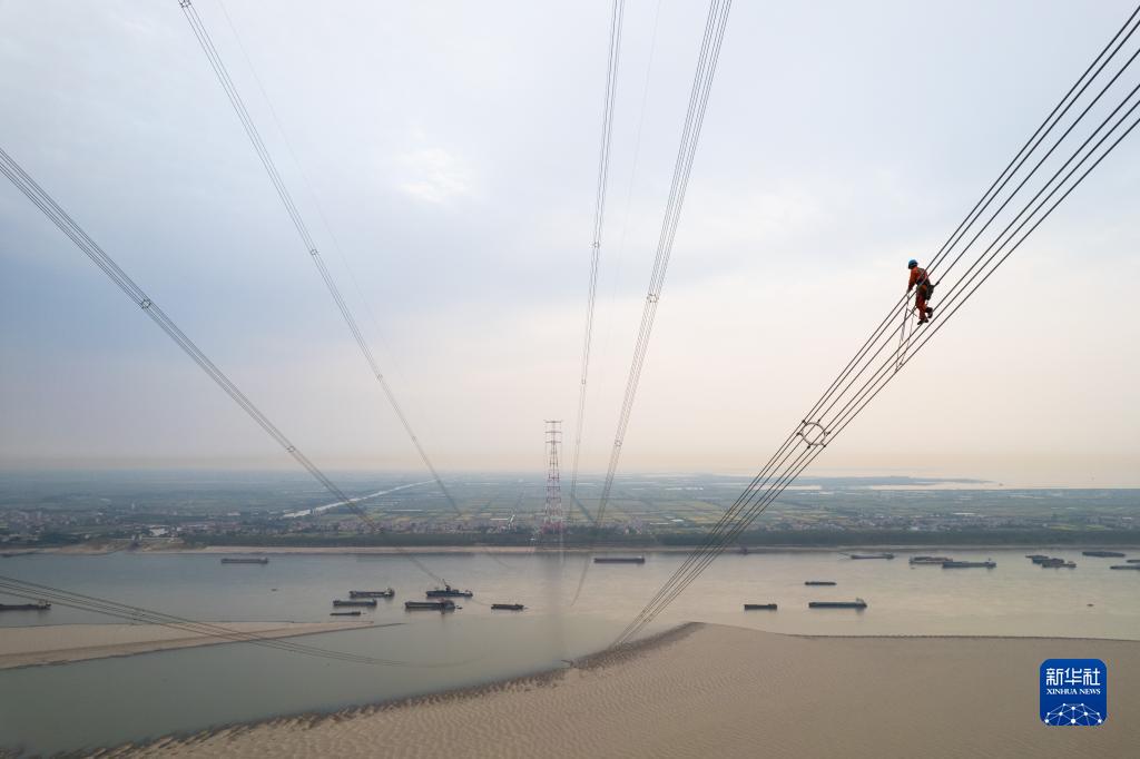 9月18日,在位于湖南省岳陽市臨湘市的南荊長特高壓工程螺山長江大跨越施工現場,國網山東送變電工程有限公司工作人員調整間隔棒(無人機照片)。