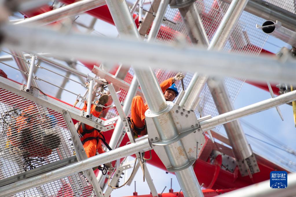 9月18日,在位于湖南省岳陽市臨湘市的南荊長特高壓工程螺山長江大跨越施工現場,國網山東送變電工程有限公司的工作人員在高空作業。