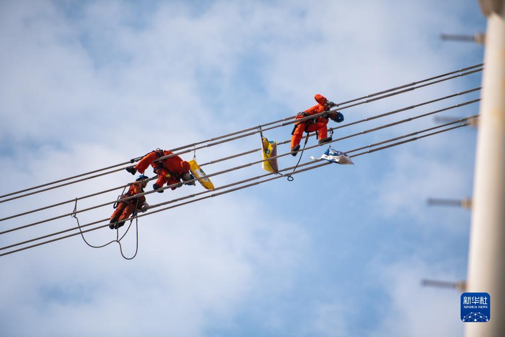 9月18日,在位于湖南省岳陽市臨湘市的南荊長特高壓工程螺山長江大跨越施工現場,國網山東送變電工程有限公司的工作人員安裝阻尼線。