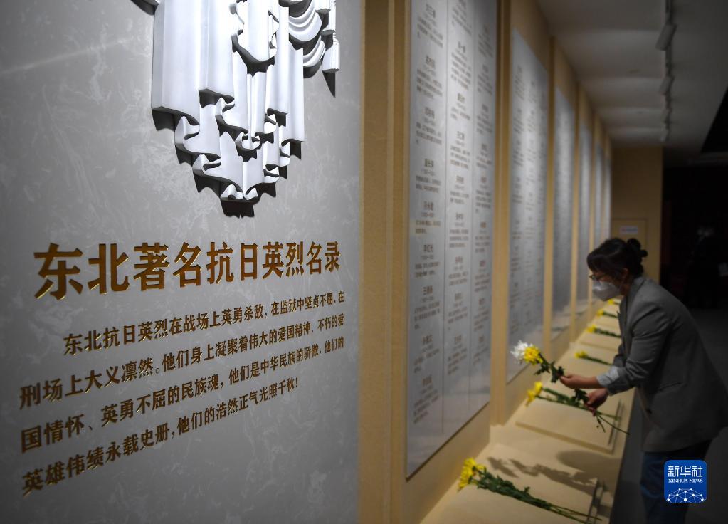 9月18日,參觀者在東北淪陷史陳列館向抗日英烈敬獻鮮花。