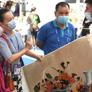 9月18日,觀眾在東博會“一帶一路”國際展區挑選白俄羅斯地毯。