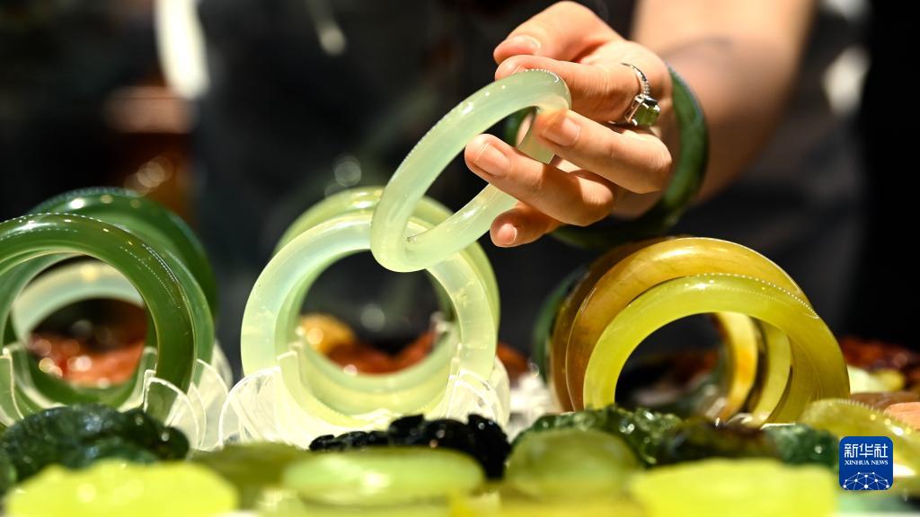 9月18日,觀眾在東博會“一帶一路”展區挑選玉鐲。