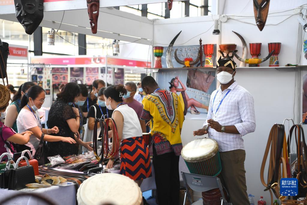 9月18日,一名加納客商在東博會“一帶一路”國際展區敲鼓招徠觀眾。