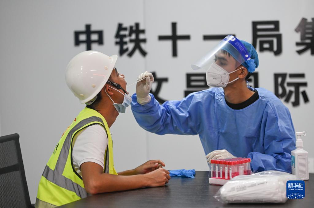 9月17日,工人在位于海南文昌的衛星總裝測試廠房項目部接受核酸檢測。