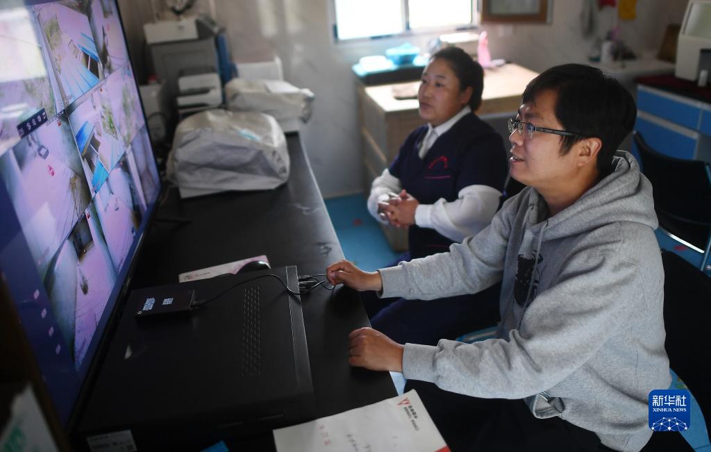 9月18日,在青海野生動物救護繁育中心,工作人員查看監控,了解荒漠貓的進食情況。