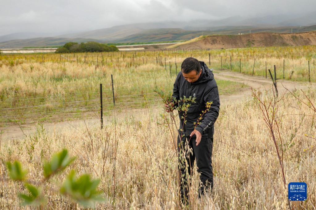 瑪曲縣自然資源局高級工程師馬建云在黃河瑪曲段干流沿岸一處阻沙林帶建設區域觀察植被生長情況(9月16日攝)。