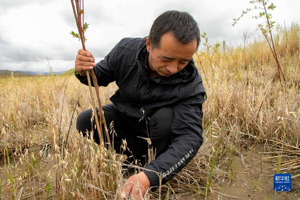 瑪曲縣自然資源局高級工程師馬建云在黃河瑪曲段干流沿岸的一處阻沙林帶建設區域觀察草方格沙障內植被生長情況(9月16日攝)。
