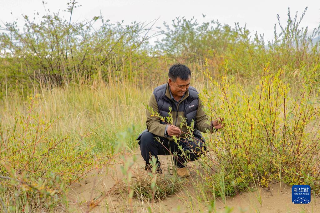 牧民卓瑪加布在黃河瑪曲段干流沿岸一處沙丘上查看他參與種植的灌木生長情況(9月16日攝)。