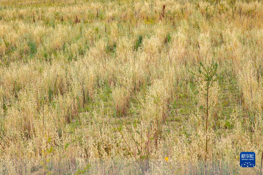 這是黃河瑪曲段干流沿岸一處阻沙林帶建設區域的草方格沙障內的植被(9月16日攝)。
