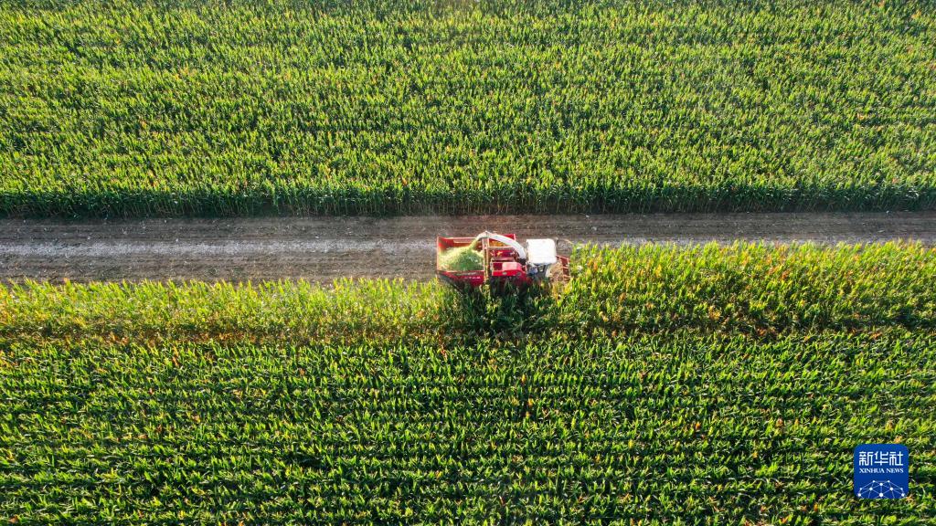 9月18日,河北省遵化市東新莊鎮后毛莊村的農民駕駛農機在田間收割玉米秸稈(無人機照片)。
