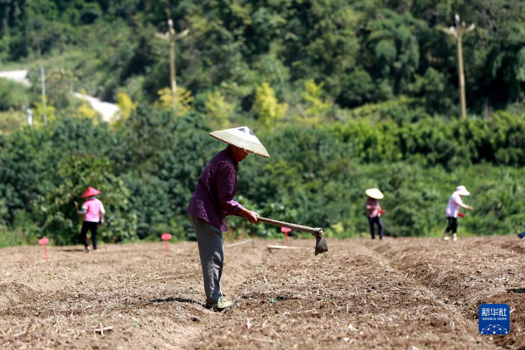 9月18日,貴州省黔南布依族苗族自治州都勻市小圍寨街道馬尾村的村民在播種油菜種子。