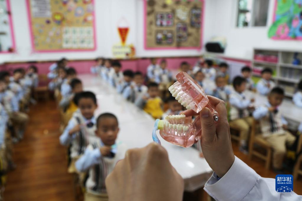9月19日,在甘肅省定西市安定區友誼幼兒園,校醫為孩子們講授正確的刷牙方式。