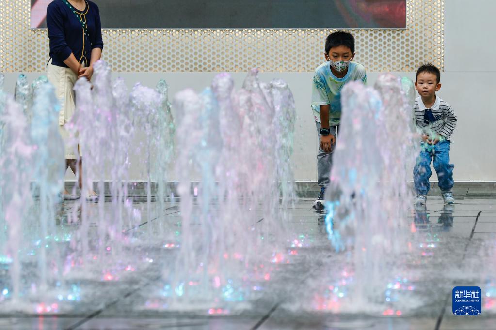 9月19日,孩子們在成都遠洋太古里欣賞音樂噴泉。