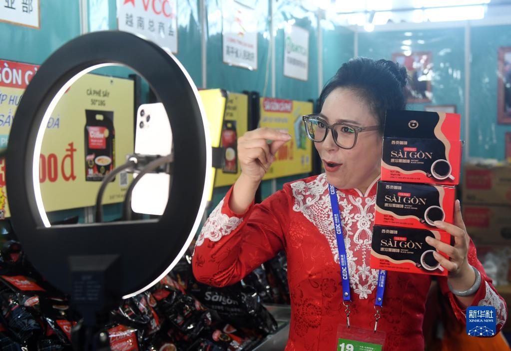9月19日,在東博會展覽現場,一名參展工作人員在通過網絡推銷越南咖啡。