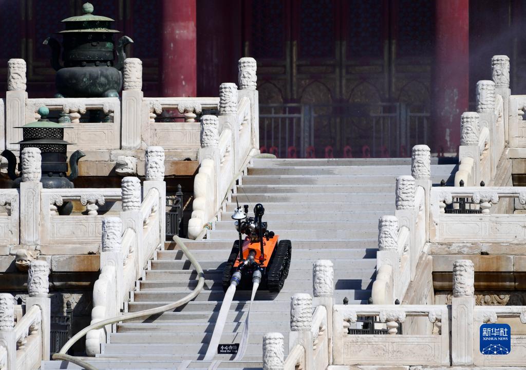 9月19日,消防機器人在故宮太和殿前進行消防演練。