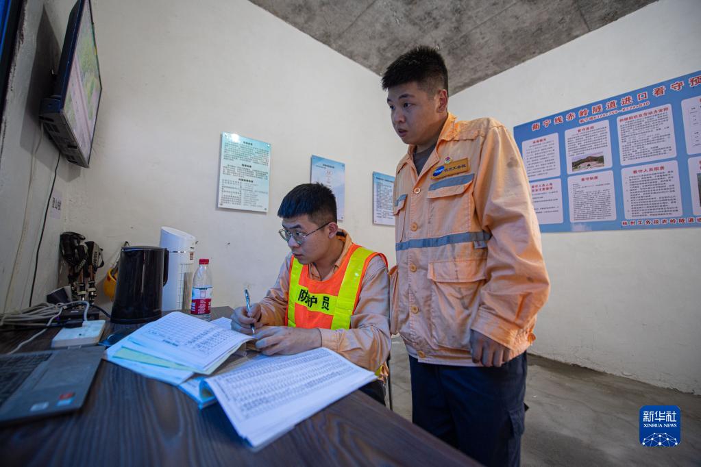 9月19日,看守員蔡金礦(右)在赤嶺隧道防洪值守點與看守員芮澎湃交接工作。