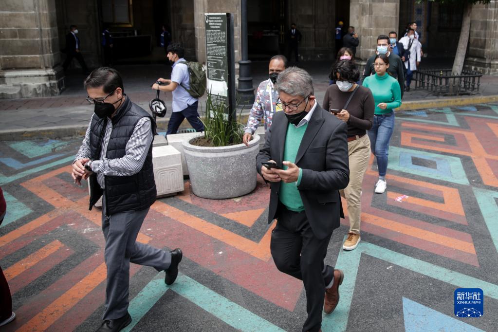 9月19日,在墨西哥首都墨西哥城,人們聽到地震警報后疏散到室外。