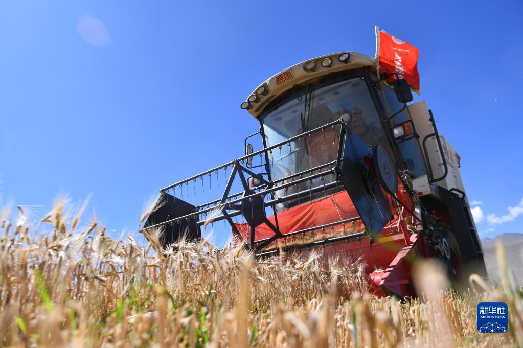 西藏日喀則市江孜縣熱索鄉努康村農機合作社的村民集中對村里三千多畝耕地進行機械化收割(9月19日攝)。