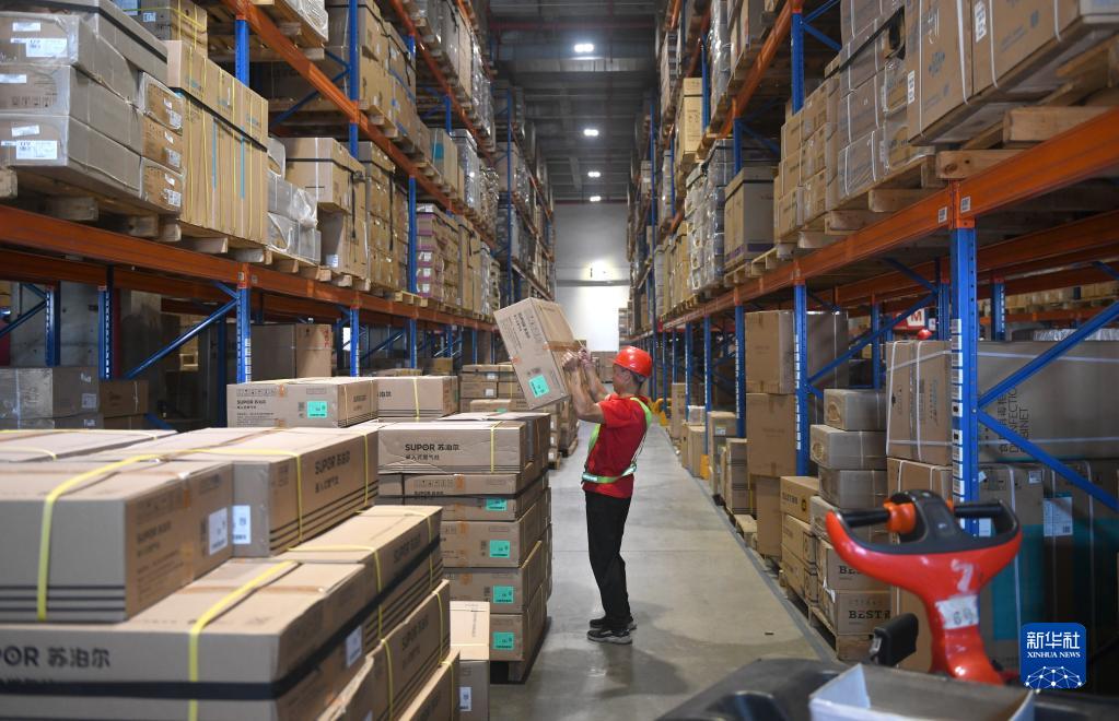 工作人員在位于廣州市開發區的京東倉庫里搬運快遞包裹(9月15日攝)。