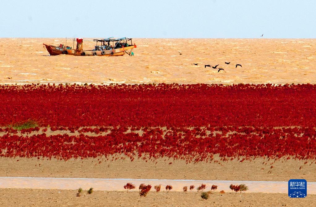近日,在山東黃河三角洲國家級自然保護區,翅堿蓬給濱海灘涂濕地鋪上“紅地毯”,成為秋季黃河口獨特的風景。近年來,保護區堅持以生態的辦法治理生態,實施濕地修復項目,達到“一次修復、自然演替、長期穩定”的良好濕地修復效果,河陸灘海復合濕地生態系統正在形成,黃河口新生濕地生態系統的原真性、完整性進一步增強。