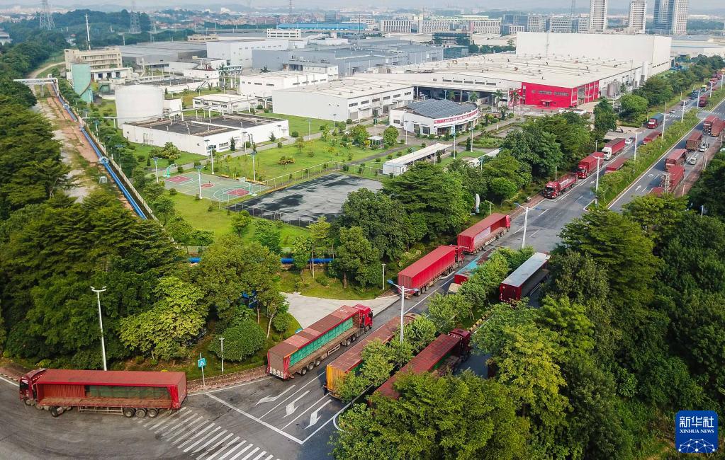 三水“水都基地”的企業外停滿物流卡車,園區巨大的飲料食品產能需要高效物流配套,也壯大了一批專業物流企業(9月17日攝,無人機照片)。