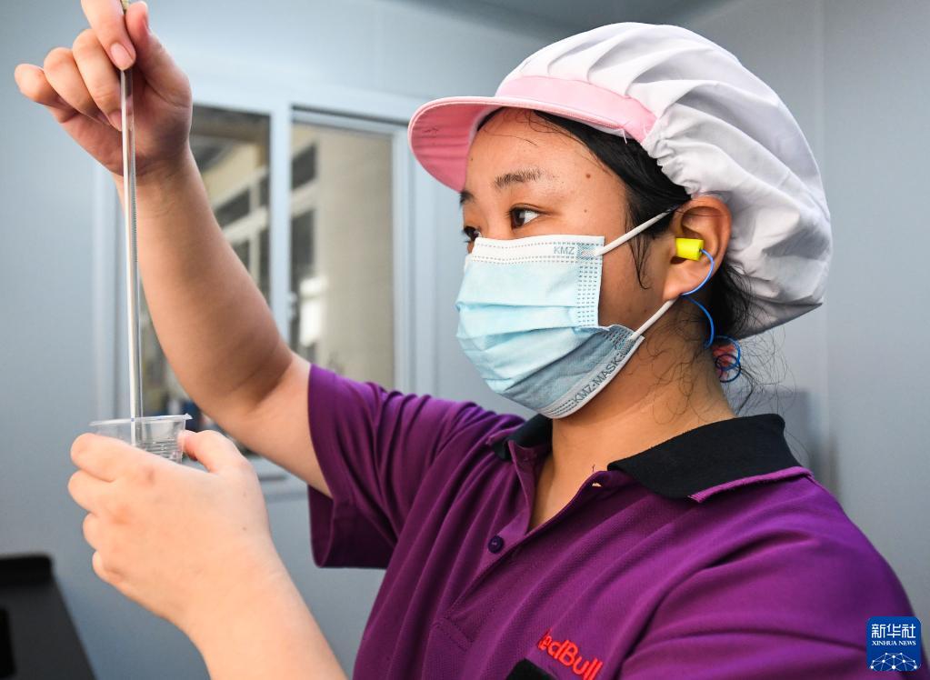 檢驗員在三水“水都基地”的紅牛維他命飲料公司車間抽檢產品糖度(9月17日攝)。