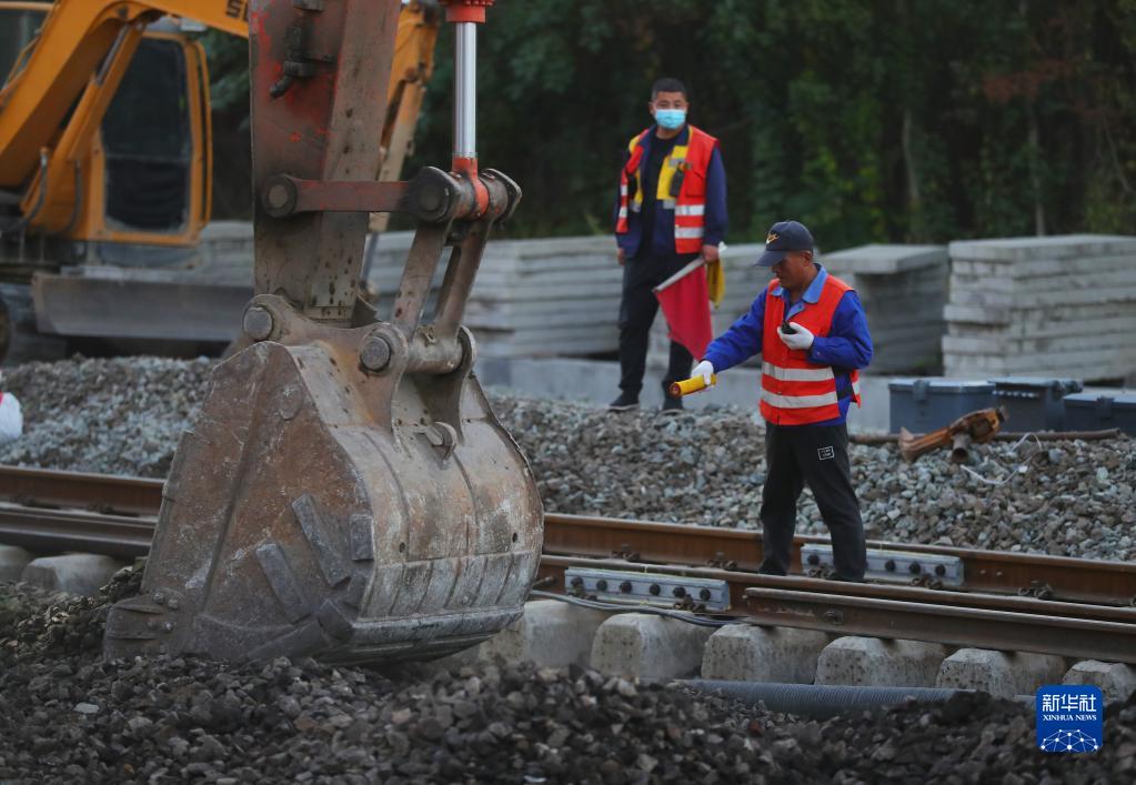 9月19日,施工人員指揮鉤機在遼寧朝陽南站站改封鎖施工現場作業。