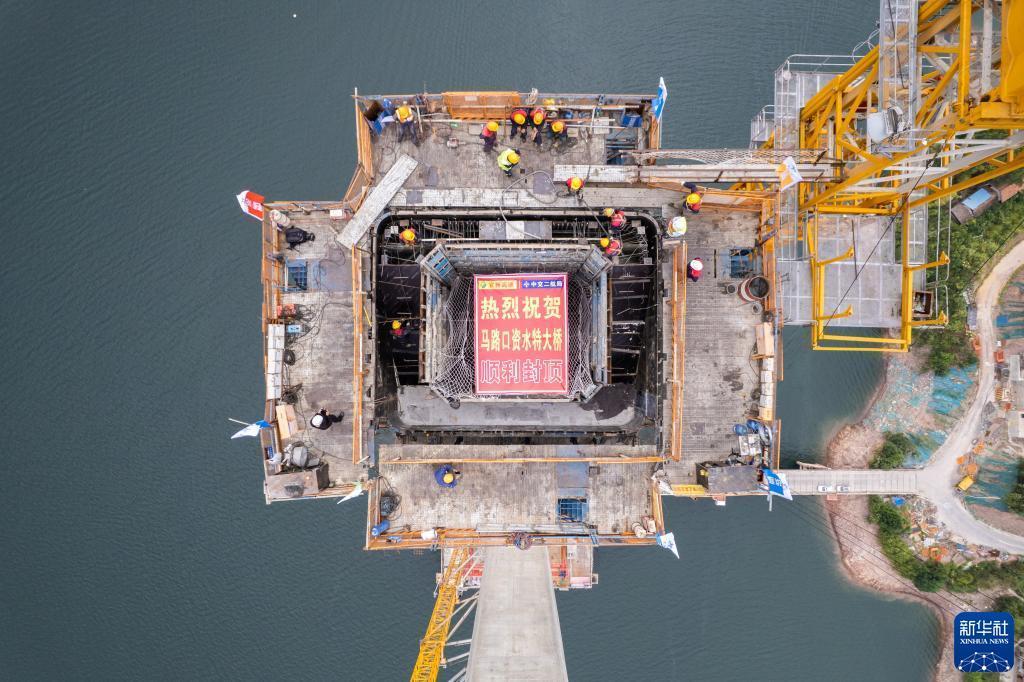 當日,官(莊)新(化)高速全線重點控制性工程馬路口資水特大橋主墩封頂,即將進入橋梁上構施工階段,為早日通車運行奠定了基礎。馬路口資水特大橋位于湖南省益陽市安化縣柘溪水庫內,全長1187米,主跨500米,其中水中主塔高202.4米。