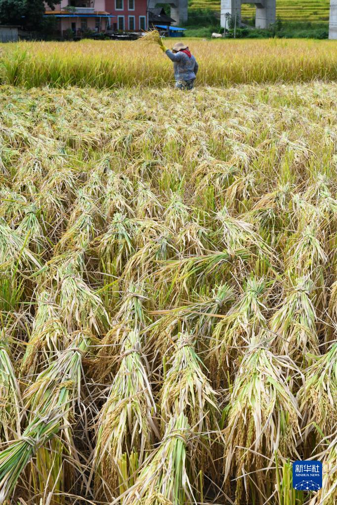 9月10日,云南勐臘縣關累鎮勐遠村農民在田間收割水稻。
